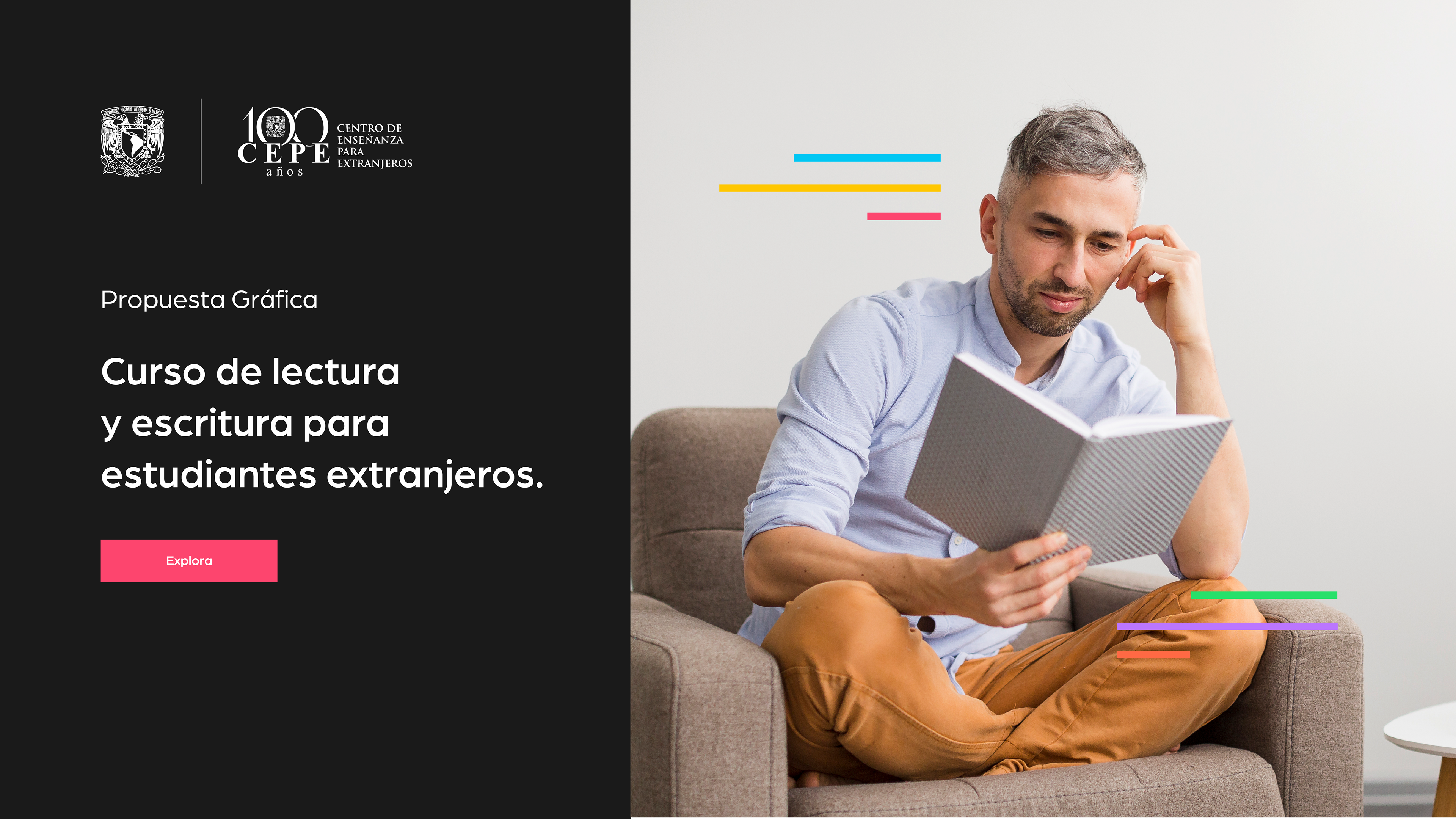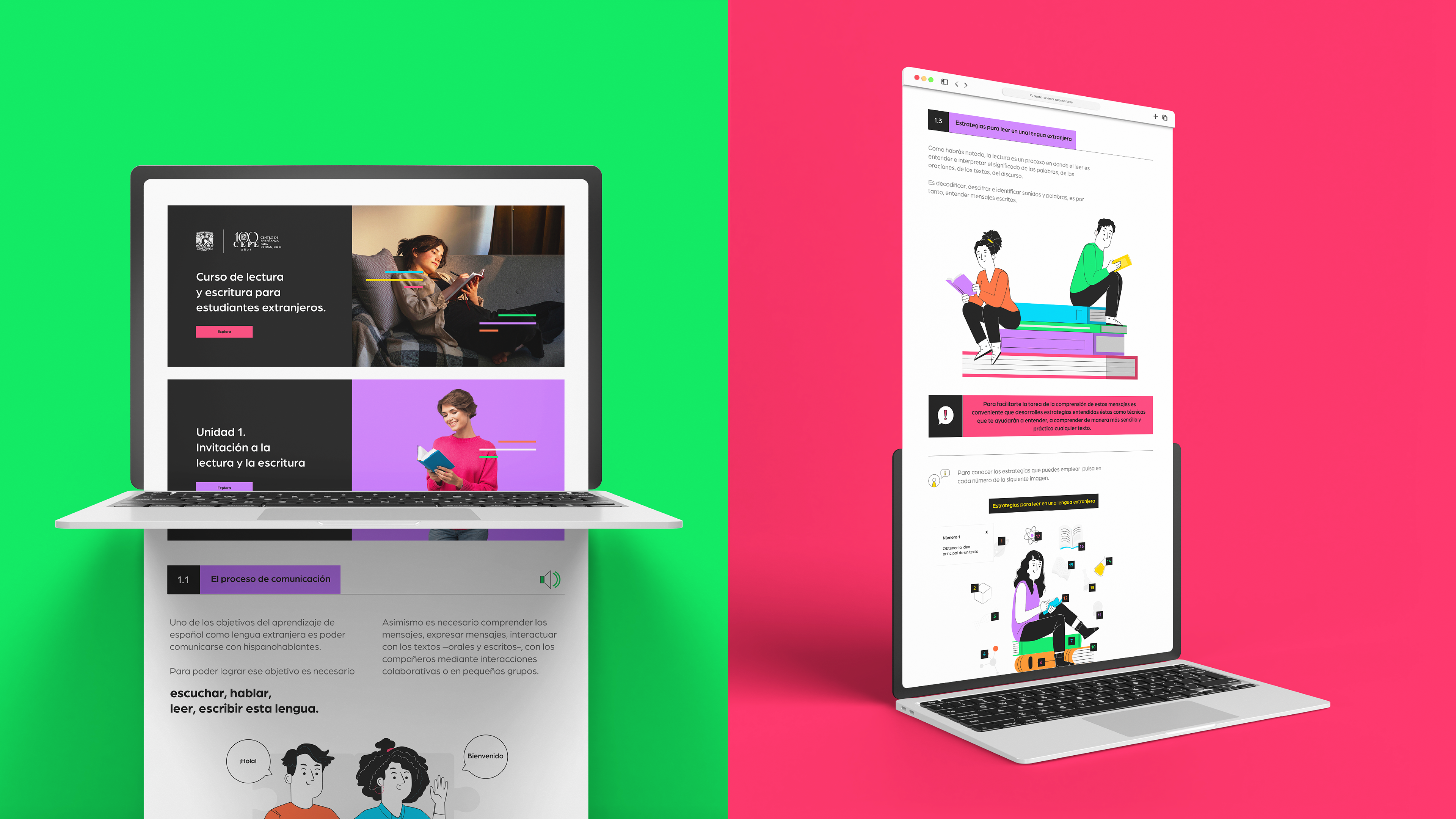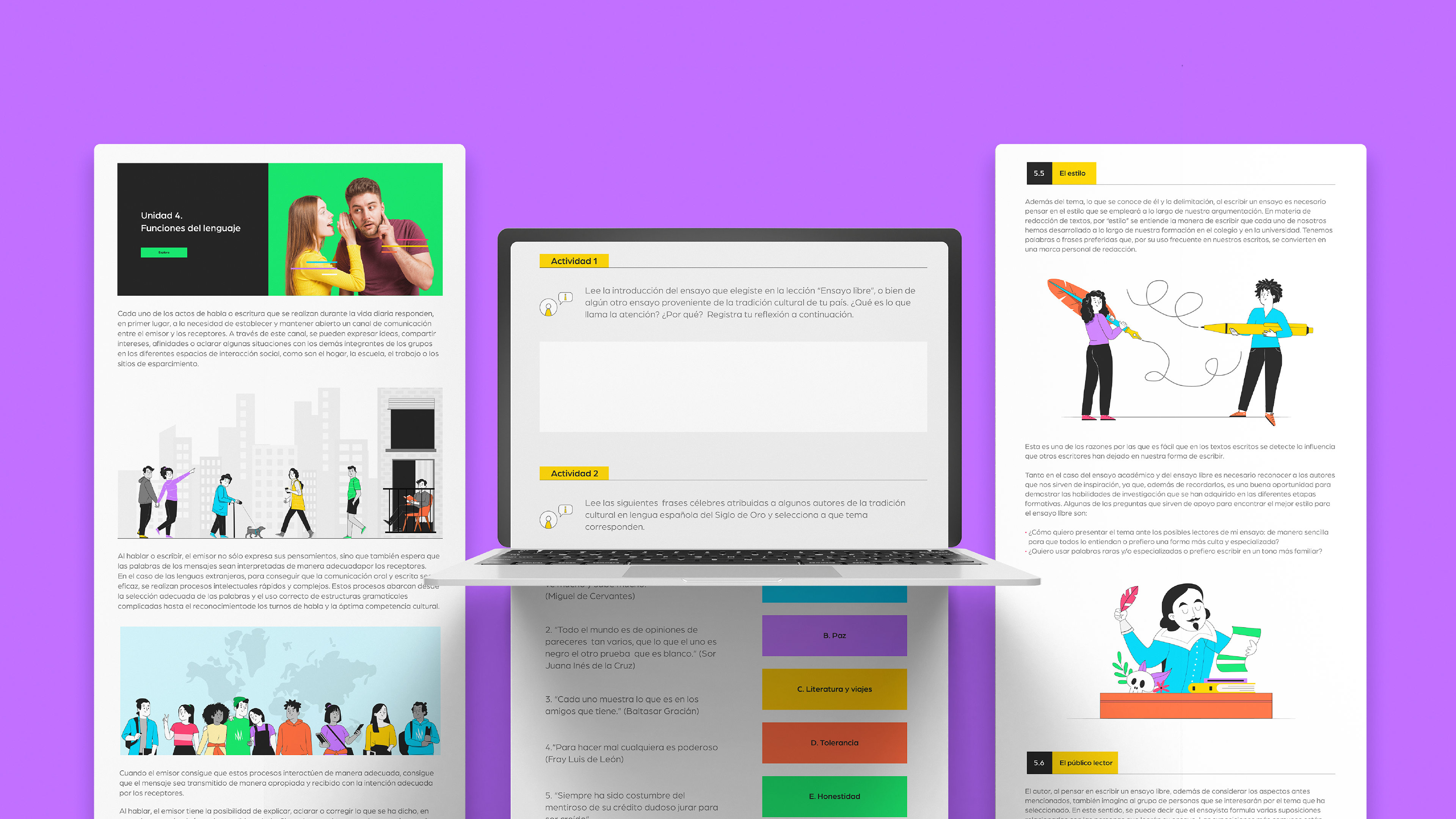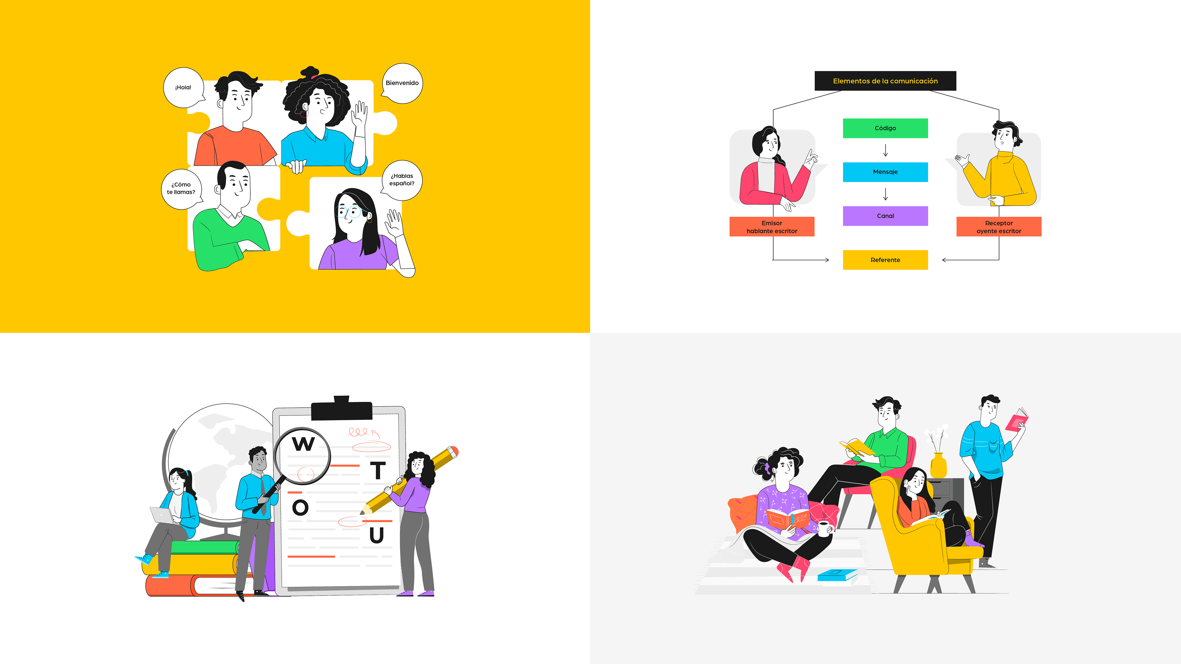 Este diseño nació para acompañar el aprendizaje del español con una identidad llena de color, ritmo y claridad. Inspirado en los procesos de la comunicación —emisor, receptor, mensaje y canal—, el concepto visual traduce la teoría en una experiencia gráfica amable y atractiva.