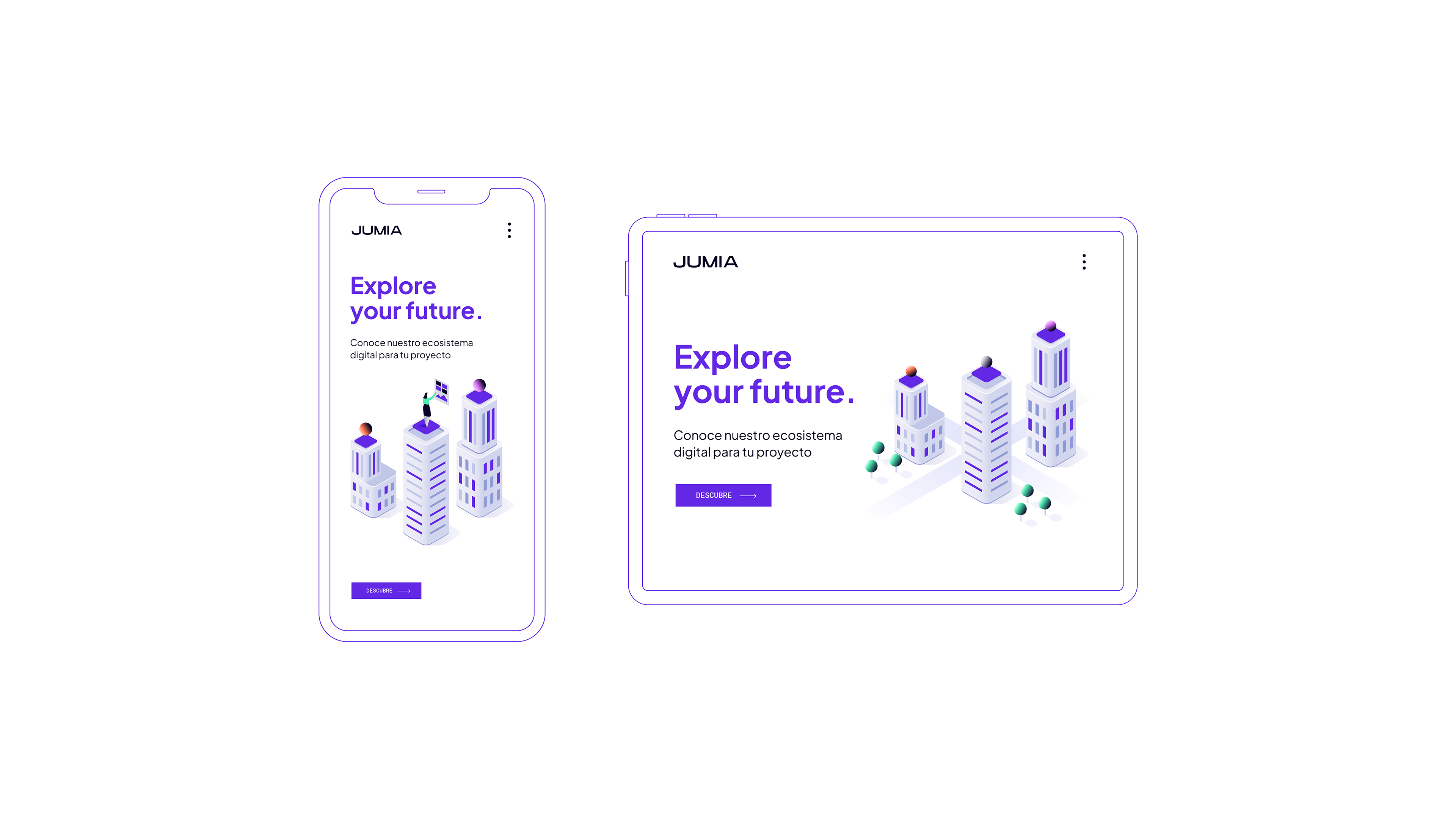 Para el ecosistema digital JUMIA, desarrollé una propuesta visual moderna y tecnológica enfocada en el sector inmobiliario. El diseño emplea una paleta en tonos morado, azul y blanco, que transmite innovación, confianza y visión de futuro.