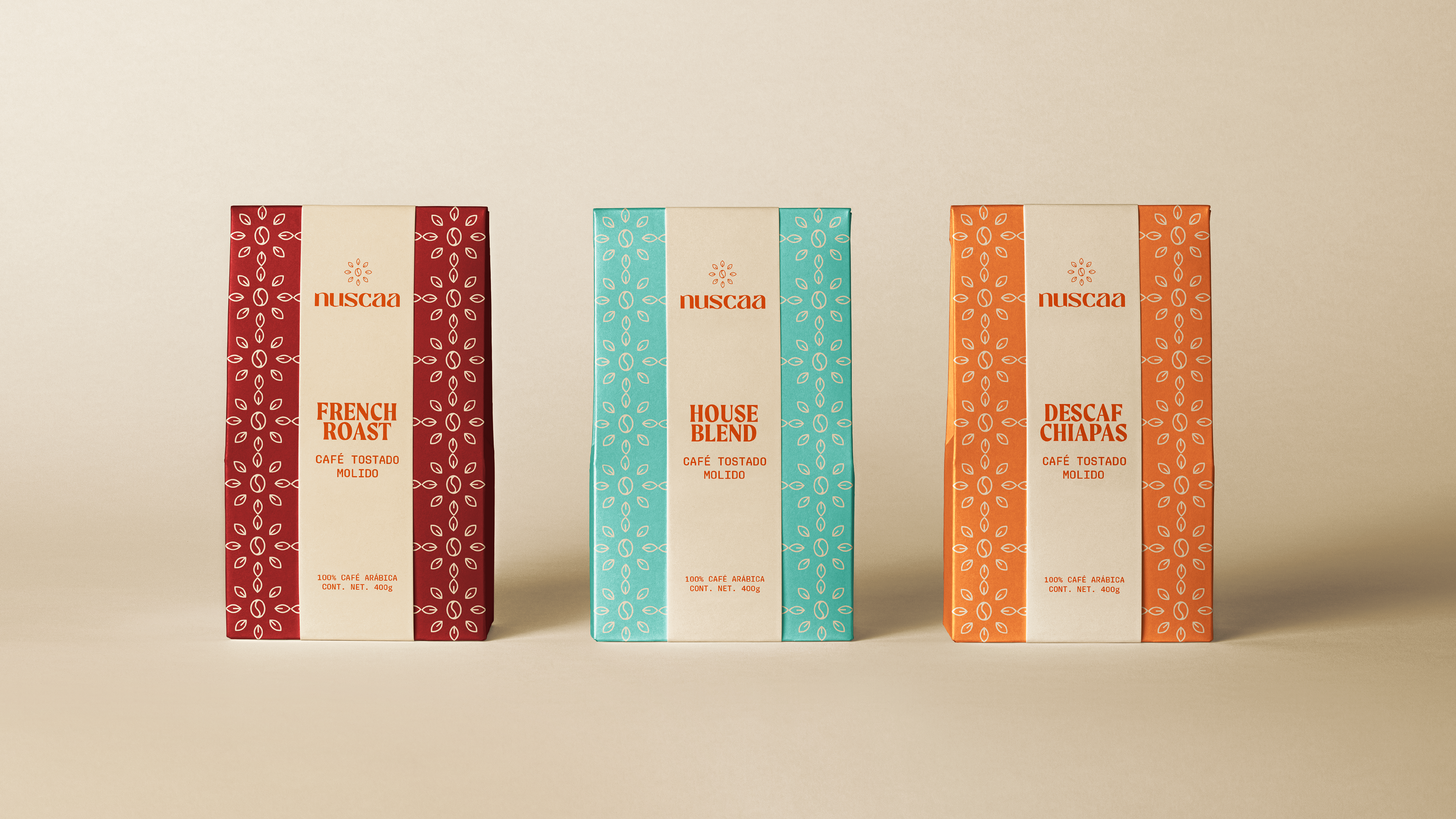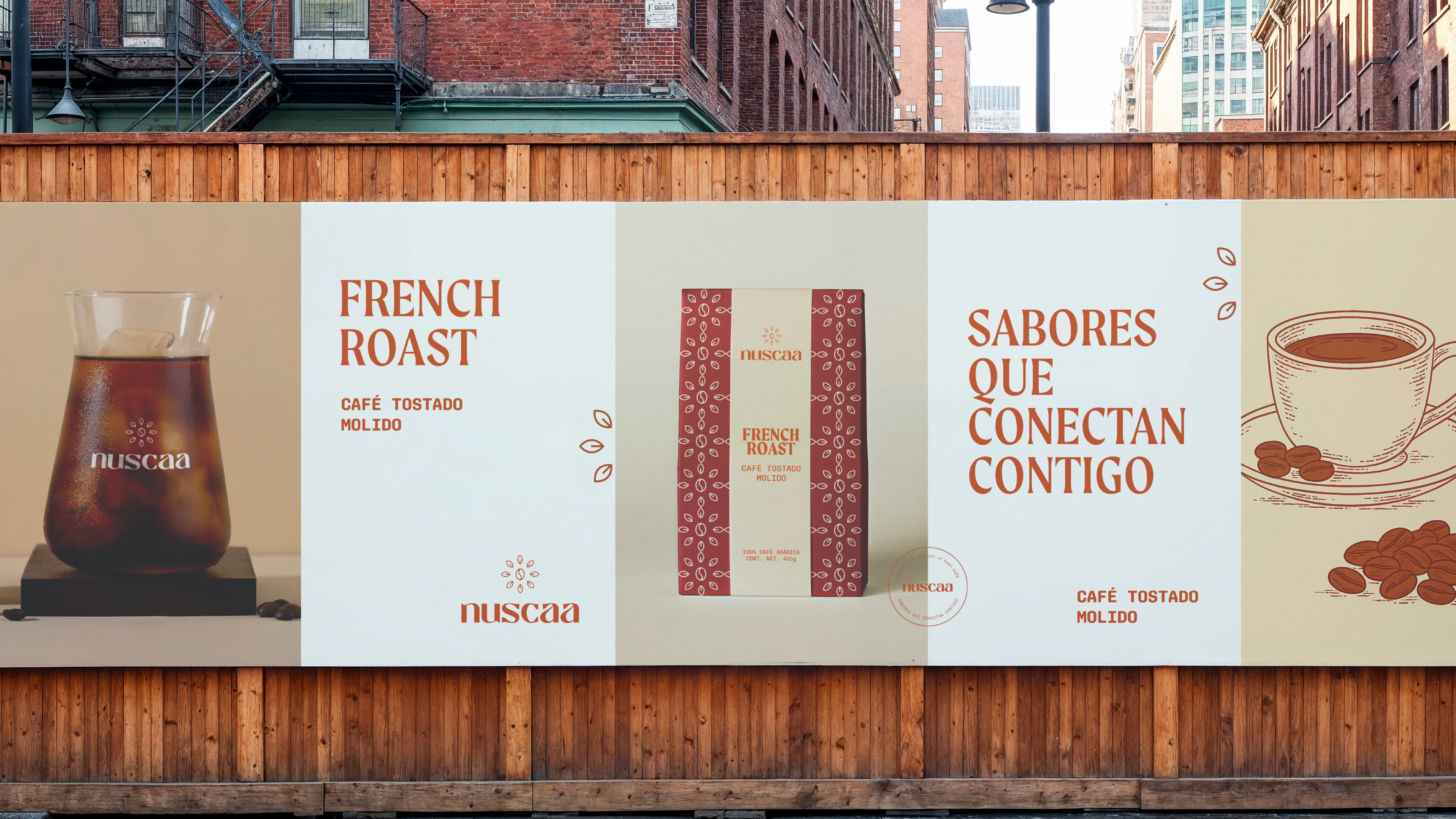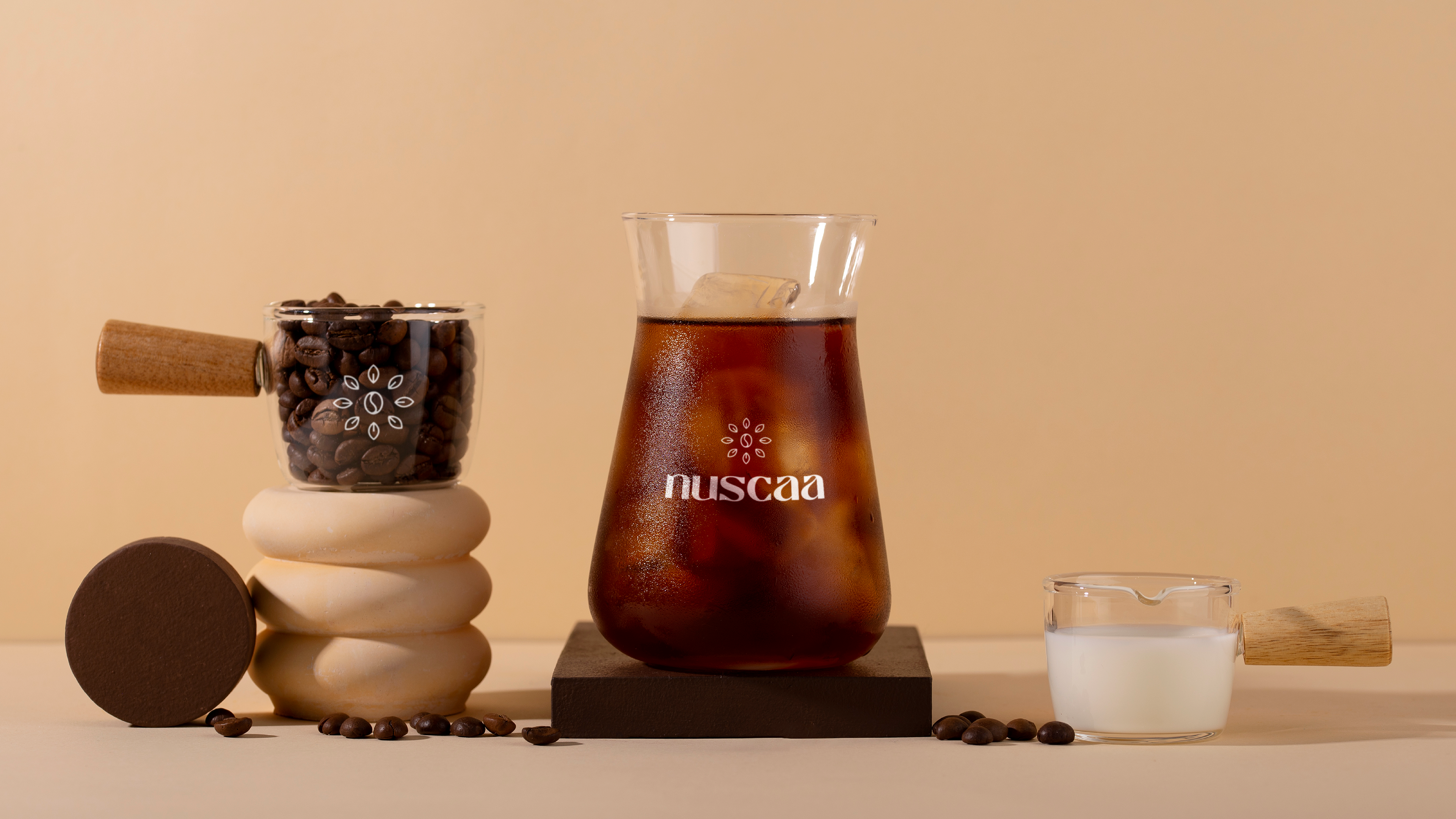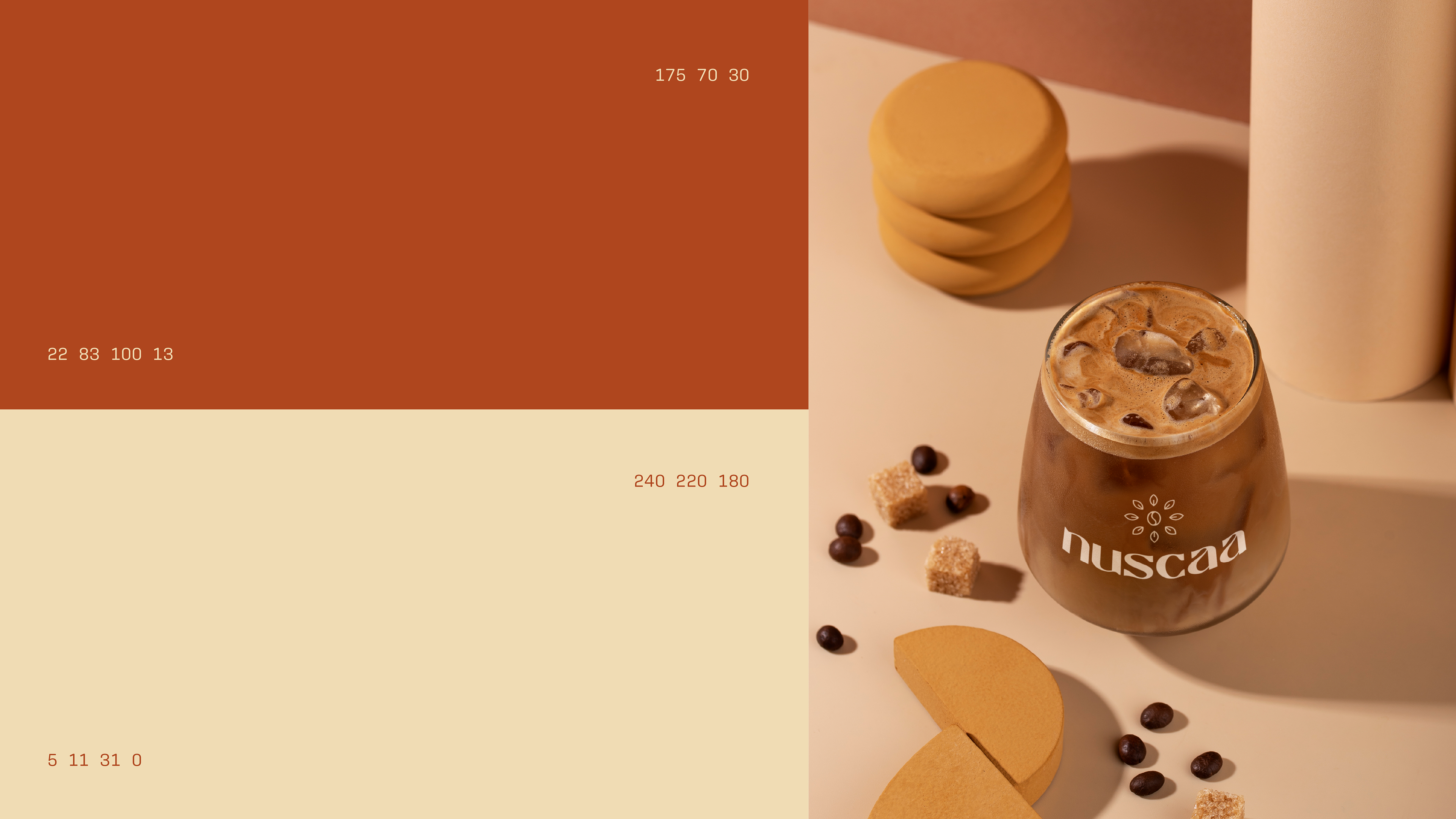 El logotipo de Nuscaa representa la esencia del café desde una perspectiva cálida y contemporánea. El símbolo principal —una semilla central rodeada por hojas estilizadas— alude al origen natural del café y al proceso artesanal que lo caracteriza. Su composición circular transmite equilibrio y armonía, mientras que el color terracota evoca la tierra, el tostado del grano y la cercanía de una experiencia auténtica.