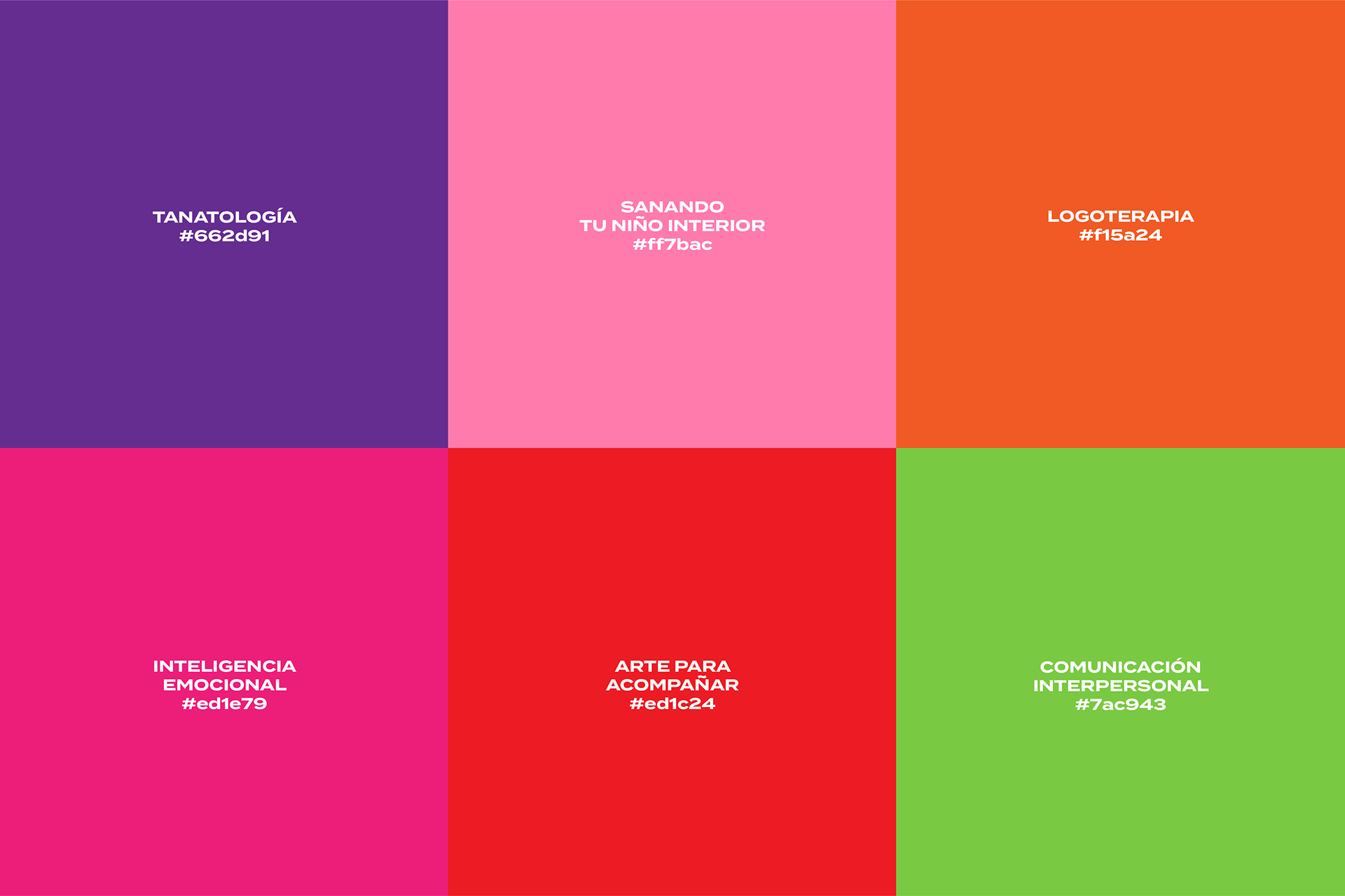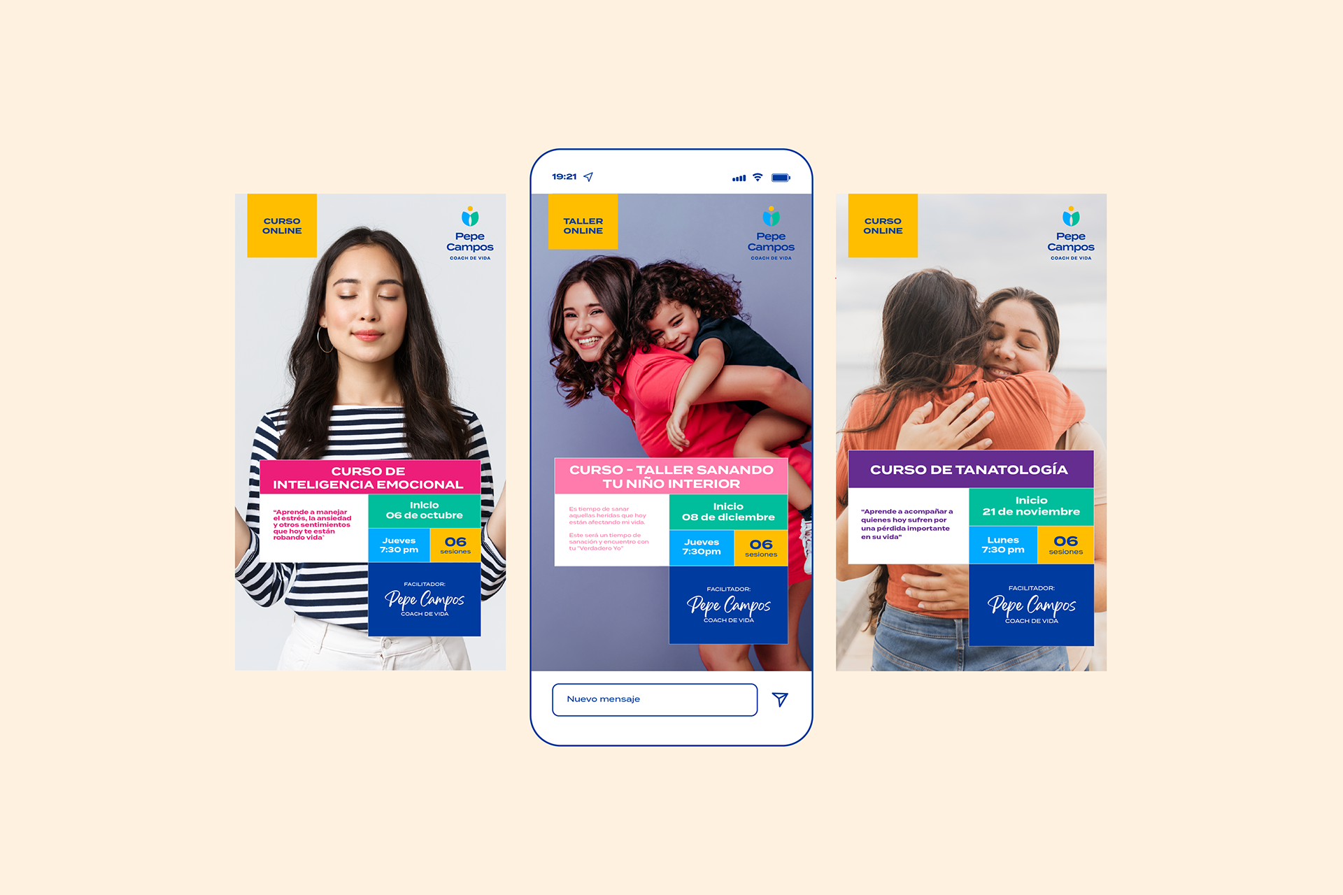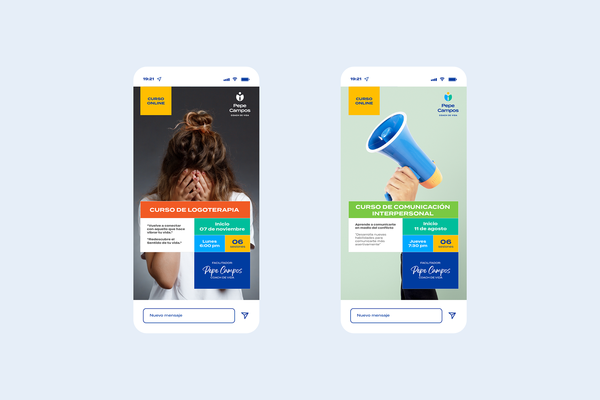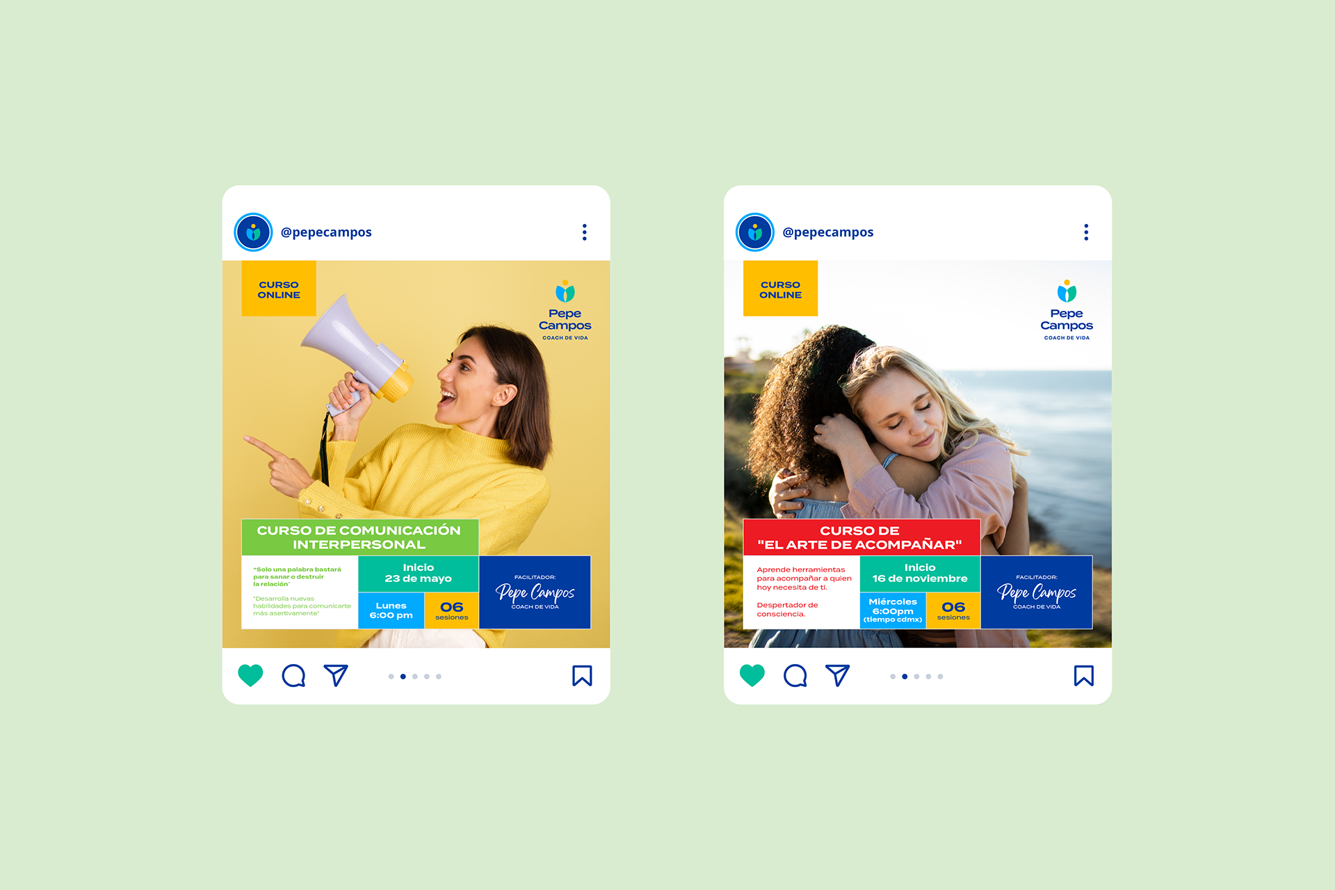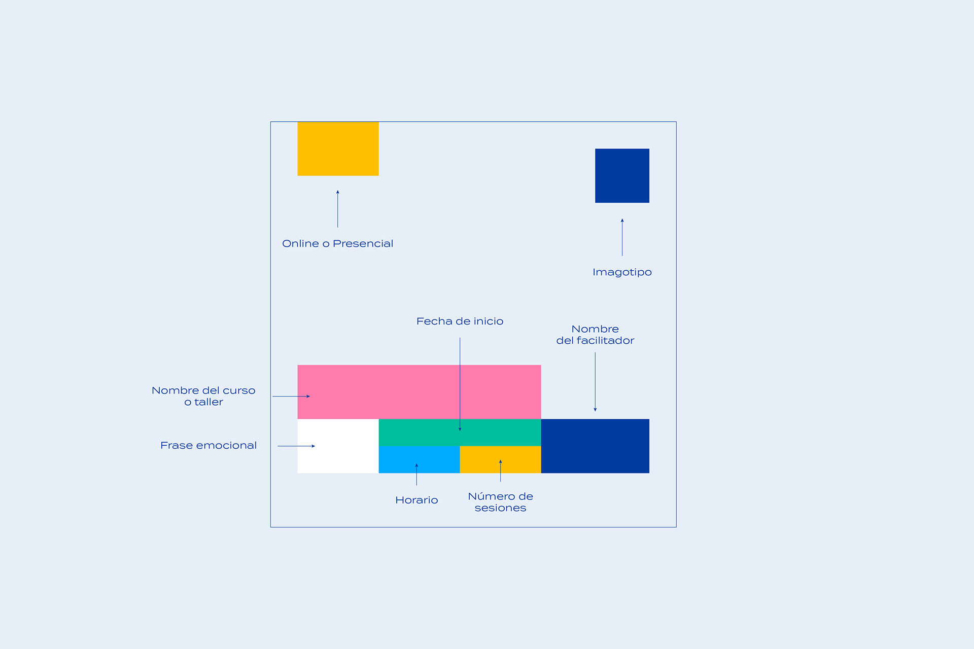 Los colores —azul, verde y amarillo— reflejan equilibrio, vitalidad y optimismo, reforzando la energía positiva de la marca. Para los materiales gráficos de los cursos y talleres, se desarrolló una línea visual colorida, moderna y accesible, donde cada módulo funciona como una pieza que encaja dentro de un mismo sistema visual.